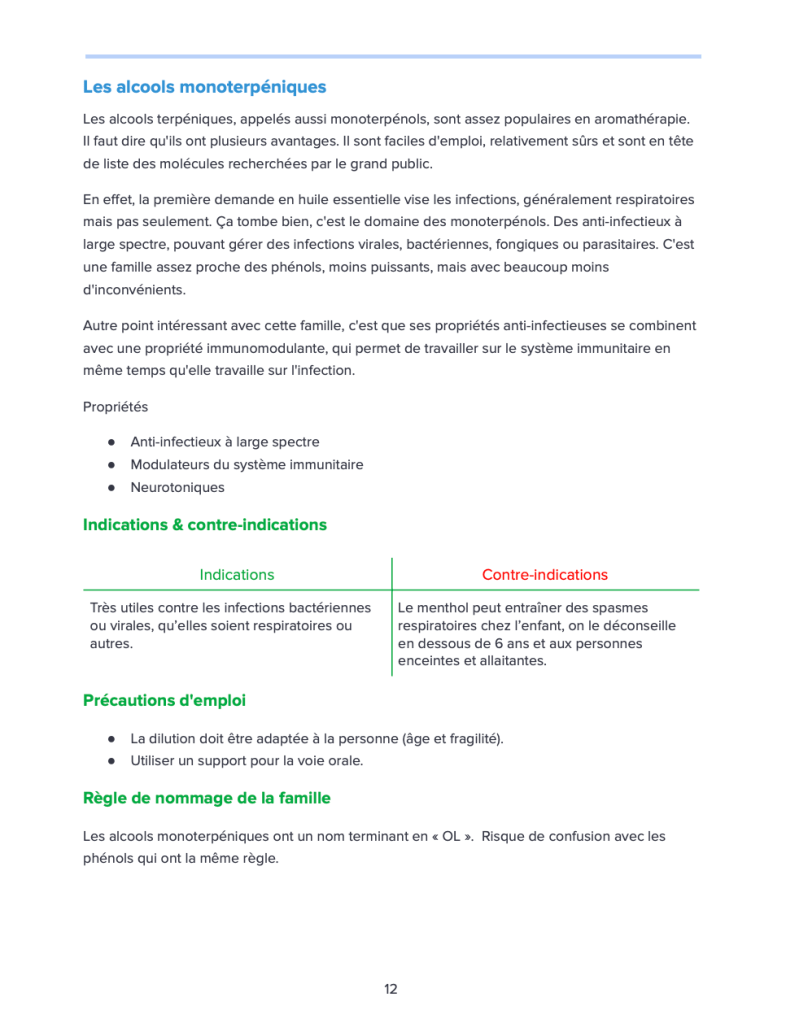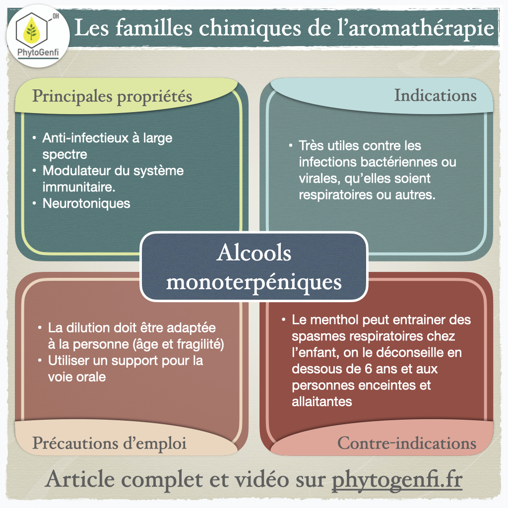 Les alcools terpéniques appelés aussi monoterpénols sont assez populaires en aromathérapie. Il faut dire qu’ils ont plusieurs avantages. Il sont faciles d’emploi, relativement sûrs et sont en tête de liste des molécules recherchées par le grand public. en effet, la première demande en huile essentielle vise les infections, généralement respiratoires mais pas seulement. Ça tombe bien c’est le domaine des monoterpénols. Des anti-infectieux à large spectre, pouvant gérer des infections virales, bactériennes, fongiques ou parasitaires. C’est une famille assez proche des phénols, moins puissants, mais avec beaucoup moins d’inconvénients.