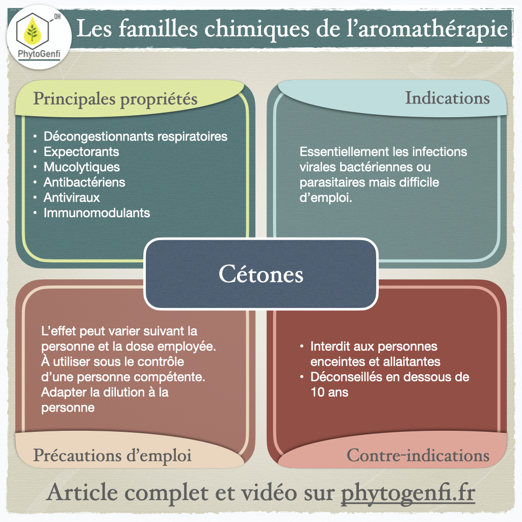 Les cétones forment une famille difficile qu’il n’est pas forcement facile de manipuler ou comprendre si on manque d’expérience. Les effets des cétones sont souvent très ciblés et il n’est pas rare d’avoir l’effet inverse que celui attendu si la dose n’est pas maitrisée. Il est donc préférable d’attendre un peu avant de manipuler cette famille avec un minimum d’aisance. Je conseille même de ne pas trop s’en occuper au début. Il est plus intéressant d’apprendre les autres familles et garder celle-ci pour la fin. On retient juste que si on se retrouve face à des cétones on fera preuve de prudence. Bien sûr rien n’empêche de les utiliser si on trouve une formule efficace élaborée par une personne compétente, mais on attendra de mieux les comprendre pour les utiliser dans une synergie personnelle.