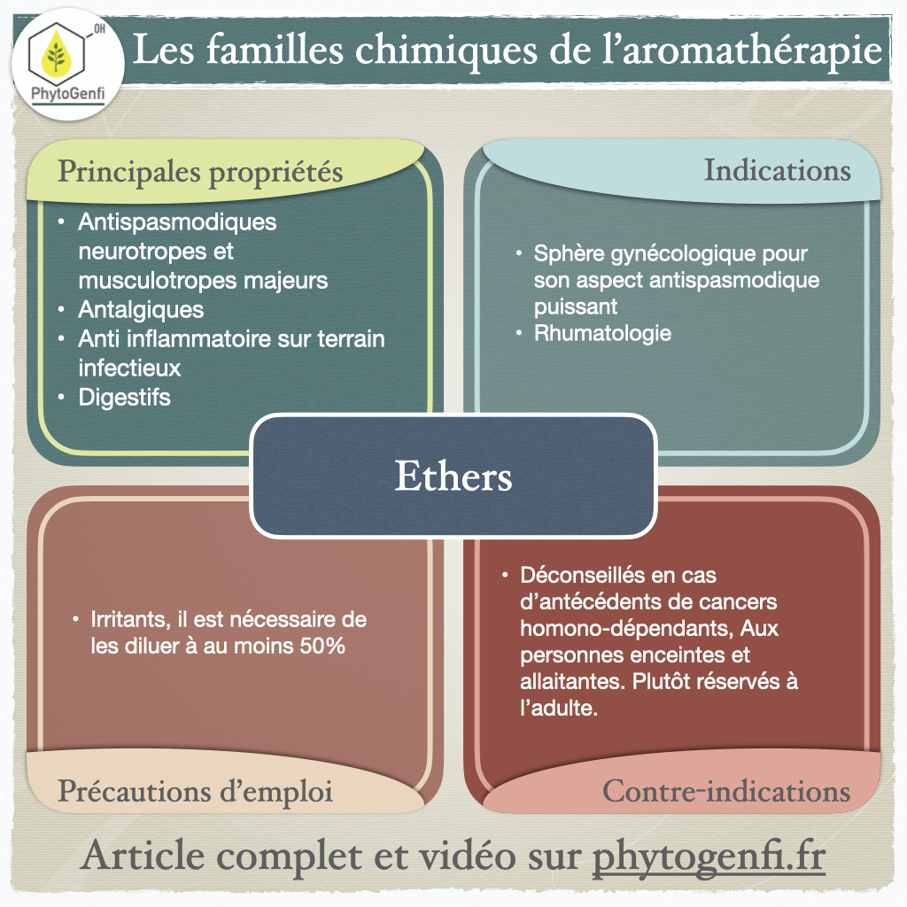 On a tendance à les confondre avec les Esters. Non seulement leur nom de famille est proche, mais en plus leurs propriétés le sont aussi. Toutefois les éthers sont des antispasmodiques majeurs et nécessitent un peu plus d’attention vis-à-vis des précautions d’emploi sur certaines huiles à éthers. En tout cas il est parfois intéressant d’associer esters et éthers pour lutter contre les spasmes utérins par exemple.
