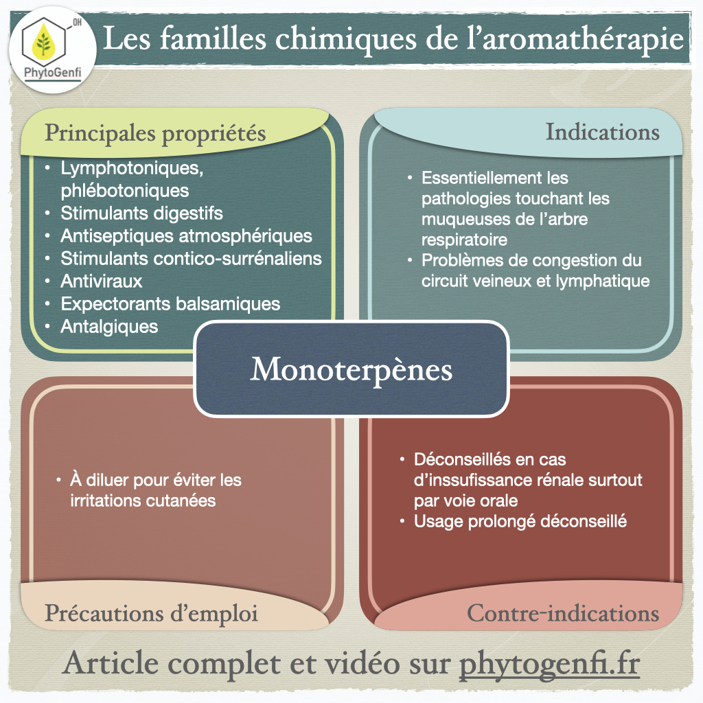 Complément intéressant des deux précédentes familles dès qu’il s’agit d’agir sur l’arbre respiratoire. Les monoterpènes sont des décongestionnants des voies respiratoires mais sont aussi très intéressants dans la prévention lorsqu’ils sont diffusés pour assainir l’air ambiant. Ils stimulent le système immunitaire et sont souvent toniques du système nerveux.