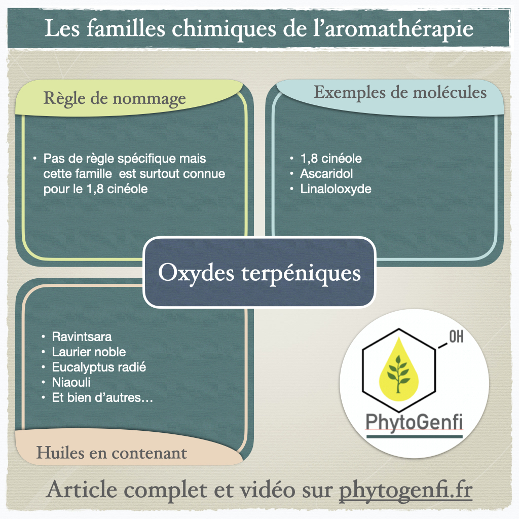 Partenaires indispensables des monoterpénols dans les affections respiratoires, l’ajout des oxydes renforce le côté antiviral de l’association des 2 familles. C’est une famille clairement respiratoire, j’en parle plus en détail dans cet article et dans cette vidéo.