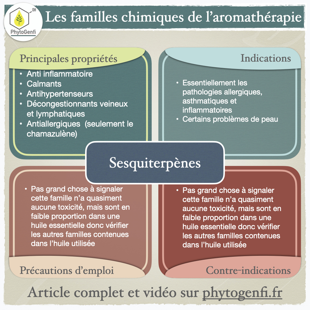 On en trouve peu dans les plantes mais la présence de sesquiterpènes n’est pas sans effet dans une huile. La famille en elle-même n’a pas vraiment de propriétés qu’on ne saurait trouver ailleurs mais un des membres de cette famille, le chamazulène a la particularité d’être anti-allergique. Et pour l’avoir utilisé ça marche plutôt bien ! On ne cherchera pas forcement une huile à sesquiterpènes, mais la présence de cette famille dans une huile peut aider à privilégier le choix d’une huile plutôt qu’une autre en fonction des propriétés recherchées. Ce peut être soit pour renforcer un effet ou soit pour ajouter un effet secondaire positif.