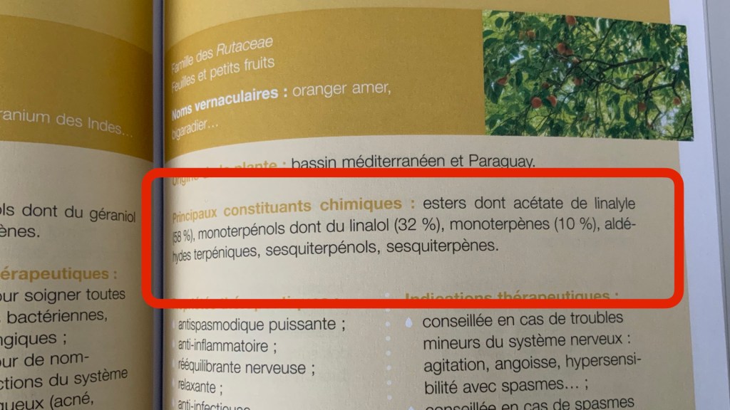Tout ça est possible car dans les livres d’aromathérapie tout comme sur les bouteilles d’huiles essentielles on a toujours accès aux noms des principes actifs qu’elles contiennent. Certains livres mentionnent même directement les familles chimiques comme dans l’exemple ci-dessous.