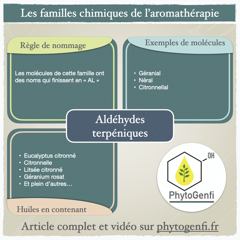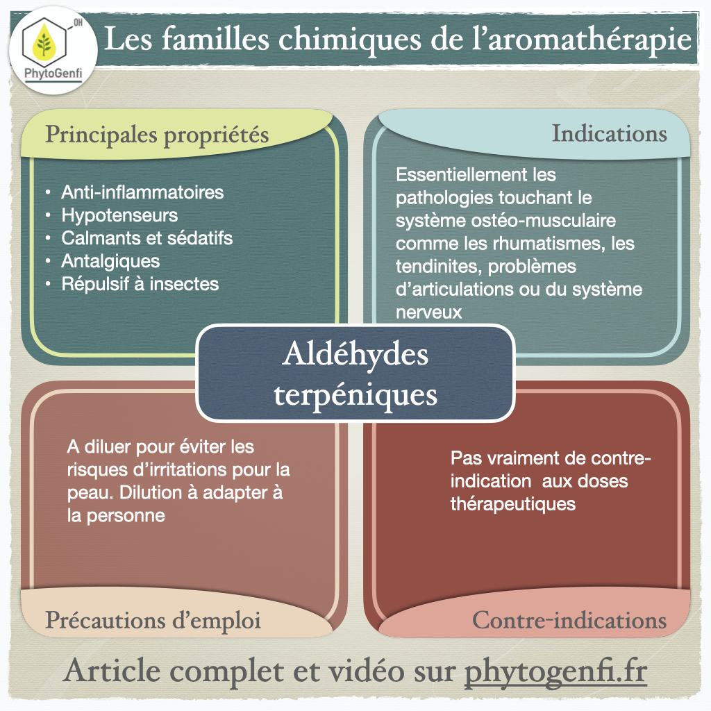À ne pas confondre avec les aldéhydes aromatiques qui sont issus d’une autre voie métabolique dans la plante. Et si les aldéhydes aromatiques invitent à la prudence, les aldéhydes terpéniques eux n’ont quasiment pas de contre-indication. On veillera juste à les diluer pour éviter les irritations cutanées. C’est une famille facilement reconnaissable à son odeur citronnée comme dans l’eucalyptus citronné. C’est une famille connue pour être anti-inflammatoire, raison pour laquelle on retrouve souvent des huiles contenant cette famille dans les synergies visant les pathologies inflammatoires de l’appareil ostéo-musculaire.
