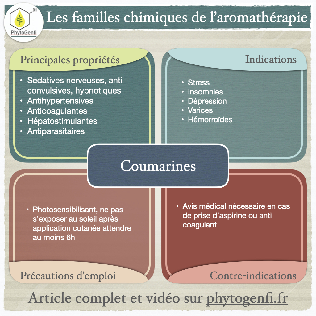 Son nom évoque la mer et le soleil, mais soleil et coumarines ne font pas bon ménage. en effet, les coumarines sont photosensibilisantes. C’est-à-dire qu’une exposition au soleil après une application cutanée engendrera une réaction chimique qui brulera la peau. C’est le point important à retenir pour cette famille. Pas d’exposition au soleil pendant les 6h qui suivent l’application. Une fois qu’on fait attention à ce point, on peut sans crainte bénéficier des propriétés des coumarines, propriétés anticoagulantes, sédatives, hypotensives par exemple. Les coumarines se trouvent généralement dans les agrumes, il est donc important d’en vérifier la présence dès qu’on a à faire à une huile essentielle d’agrume.