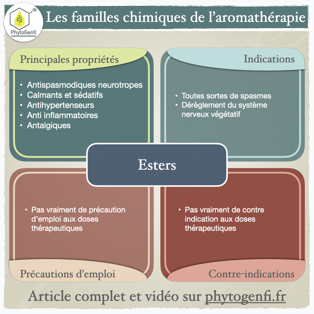 Autre famille importante de l’aromathérapie, les esters sont intéressants dès qu’il s’agit de calmer d’apaiser, de détendre. Une famille qui agit aussi bien sur le système nerveux central que périphérique. Ils décontractent les muscles lisses ce qui en fait de bons antispasmodiques. C’est une famille importante dans la gestion du stress. Intéressant aussi bien contre les spasmes utérins que les spasmes intestinaux. Je ne rentrerai pas dans le détail dans cet article mais c’est quasiment une famille dans laquelle on peut choisir l’intensité de l’action recherchée car l’efficacité des esters est proportionnelle au nombre d’atomes de carbone. On retiendra juste qu’on peut classer les esters entre eux.
