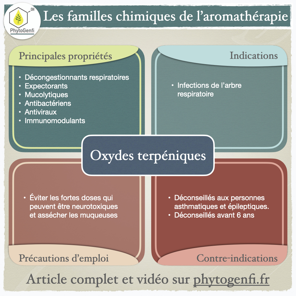 Partenaires indispensables des monoterpénols dans les affections respiratoires, l’ajout des oxydes renforce le côté antiviral de l’association des 2 familles. C’est une famille clairement respiratoire, j’en parle plus en détail dans cet article et dans cette vidéo.