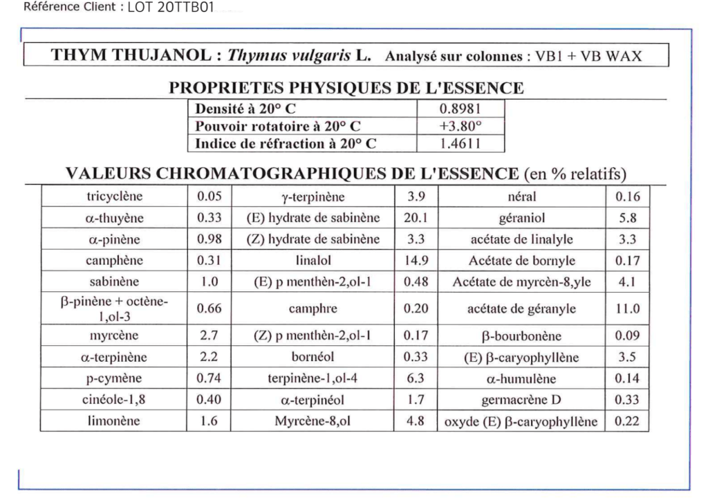 Une bonne huile essentielle de thym à thujanol doit contenir d’après le guide terre vivante des huiles essentielles :