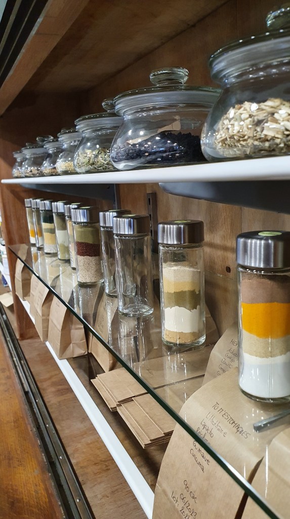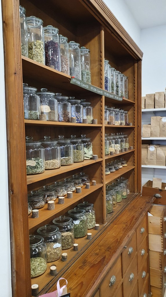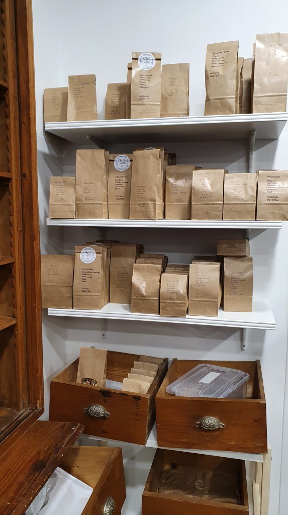 La première impression qui se dégage de la boutique est tout simplement qu’elle est jolie ! On y retrouve les étagères d’origines remplies de bocaux de plantes (plus récentes 😁). Des espaces bien identifiables pour les plantes, les huiles essentielles, etc. On y trouve des plantes en vrac et des tisanes faites maison ! Et là on peut dire que l’équipe a fait preuve d’une grande originalité pour baptiser les mélanges ! Je suis sûr que vous trouverez sans mal à quoi servent les tisanes « N’incyste plus » , « L’hépanouie », « La flexible », « L’attrape-coeur » ou encore « Réveil-matin ». Pour rappel, il n’est pas autorisé de faire des allégations thérapeutiques pour des mélanges de plantes. Il faut donc savoir se montrer créatif ! Bravo pour toute cette originalité !