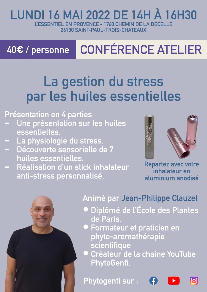 Le lundi 16 mai, je vous propose de nous retrouver dans la Drôme, et plus précisément dans la boutique l’essentiel en Provence dont je vous avais déjà parlé, pour une conférence atelier, sur la gestion du stress par les huiles essentielles . Pendant cette conférence on procèdera à une distillation de lavande et on réalisera un stick inhalateur anti-stress personnalisé.