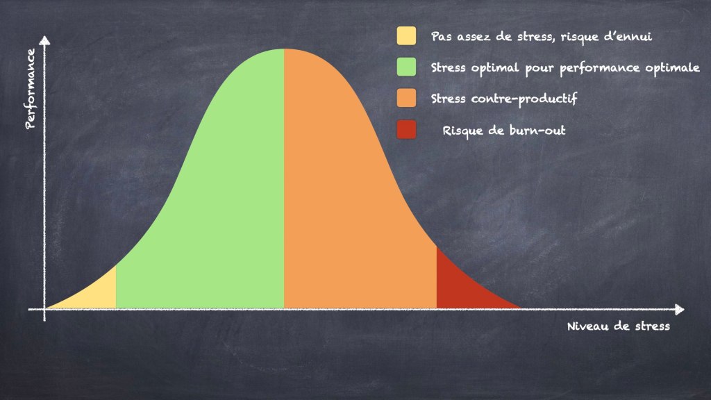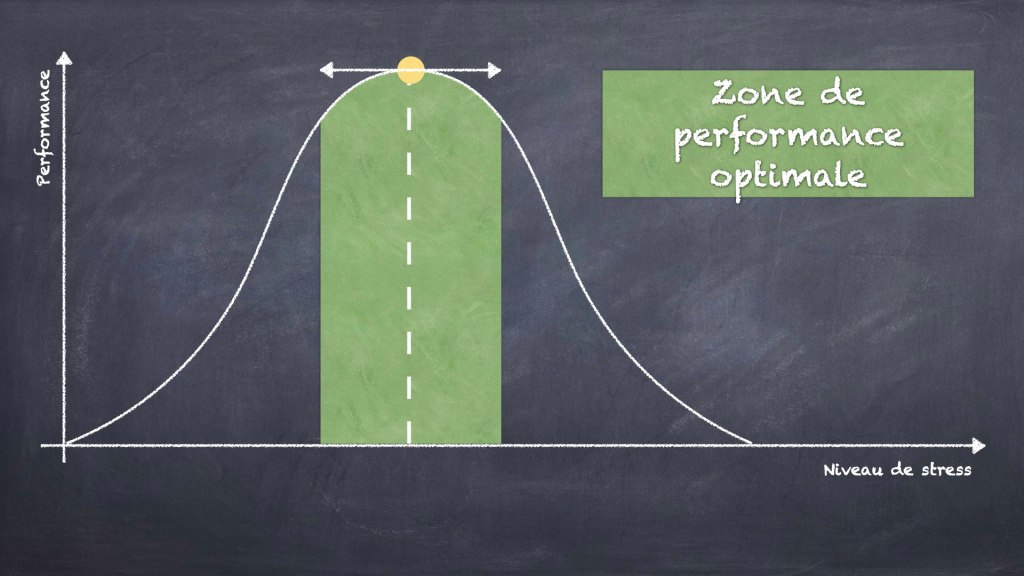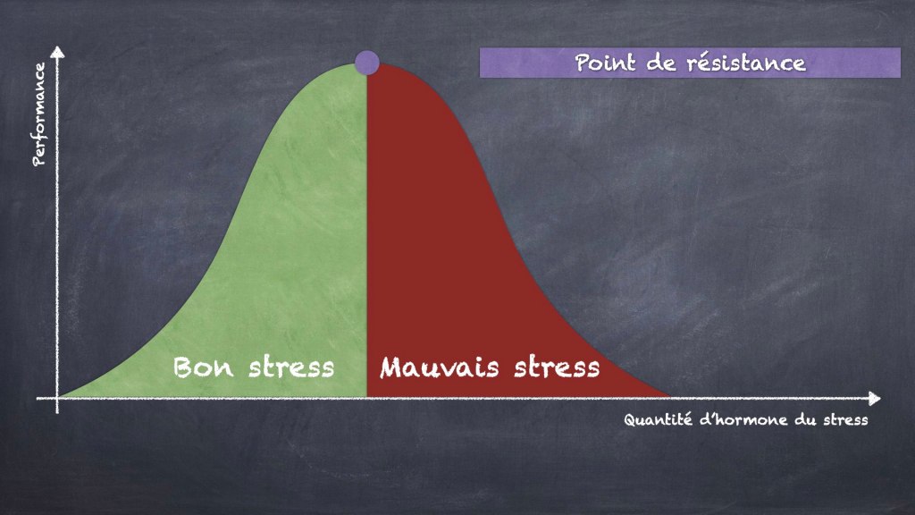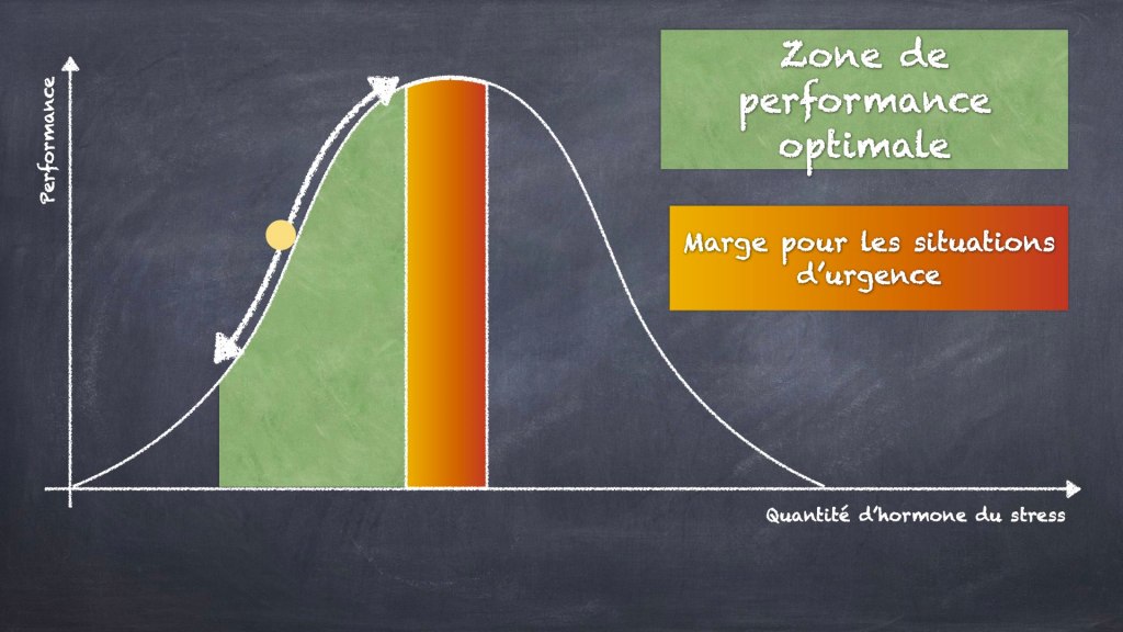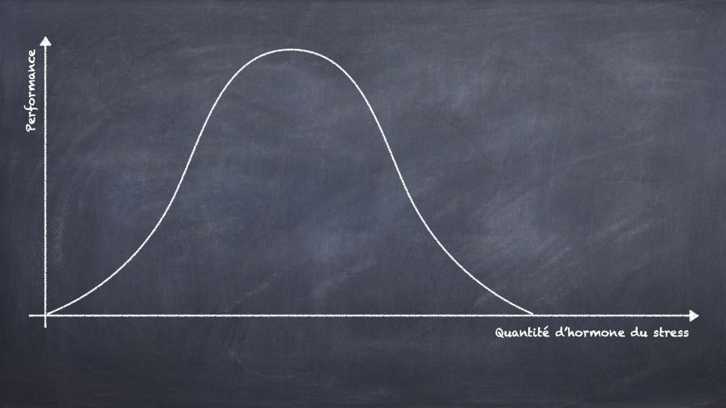 Cette courbe montre qu’une quantité modérée des hormones de stress apporte un gain de performances et qu’une quantité supérieure à un seuil nous fait perdre la performance gagnée.