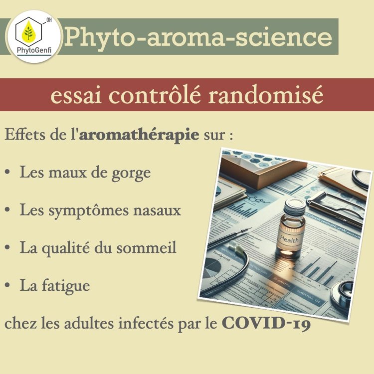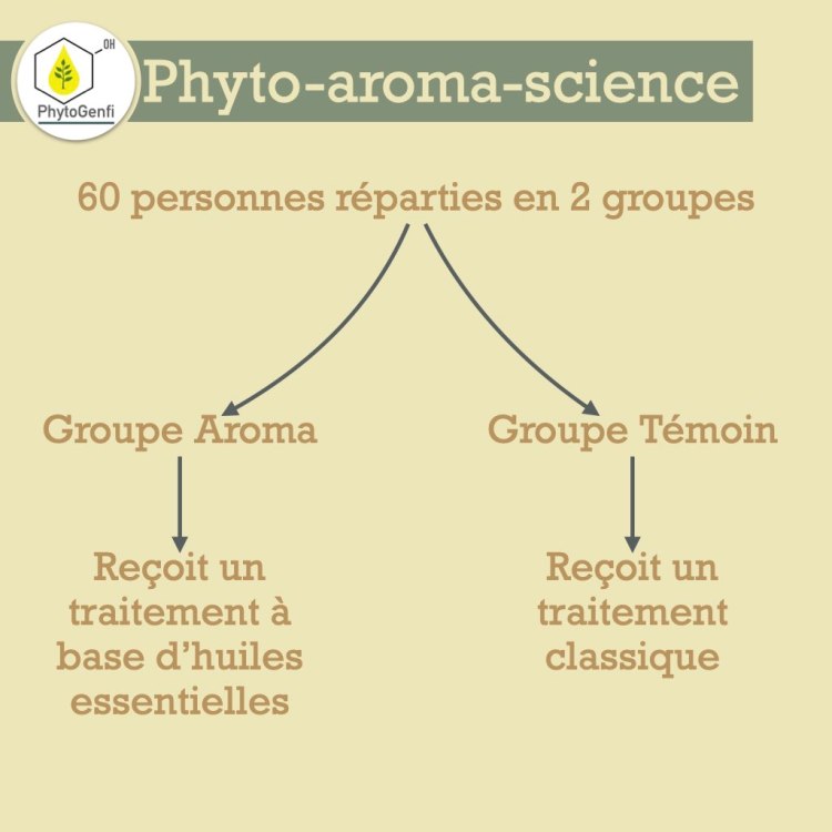 60 personnes infectées par le SARS-COV-2 réparties en 2 groupes de 30 personnes, un groupe aroma et un groupe témoin. Le groupe témoin reçoit le traitement conventionnel, le groupe aroma reçoit un traitement à base d’huiles essentielles. L’objectif est d’évaluer l’intérêt de l’aromathérapie suivant 4 axes :