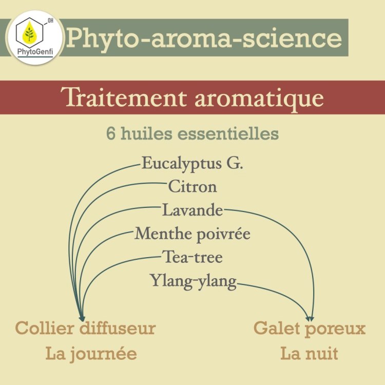 La synergie est construite suivant la répartition ion suivante : 3/3/2/2/1 dans l’ordre d’apparition de la liste ci-dessus. Puis 1cc du mélange est versé dans le collier diffuseur. Les personnes doivent porter le collier et procéder à 3 olfactions de 1 minute par jour.