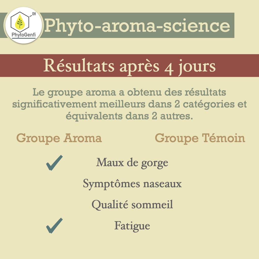 Sur les 4 critères observés, le groupe aroma avait 2 critères sans différence significative avec le groupe témoin. Il s’agit des critères symptômes nasaux et qualité du sommeil. Sur les deux autres critères, le groupe aroma a obtenu des résultats significativement meilleurs que le groupe témoin.