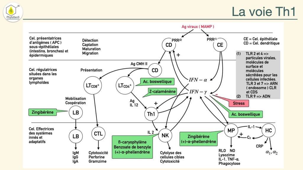 À ce stade, on aura les connaissances nécessaires pour comprendre les trois réponses immunitaires principales que sont la voie Th1 qui se met en place contre les infections virales, la voie Th17 qui se met en place contre les infections bactériennes et la voie Th2 qui se met en place contre les parasites mais qui s’active aussi en cas d’allergie.