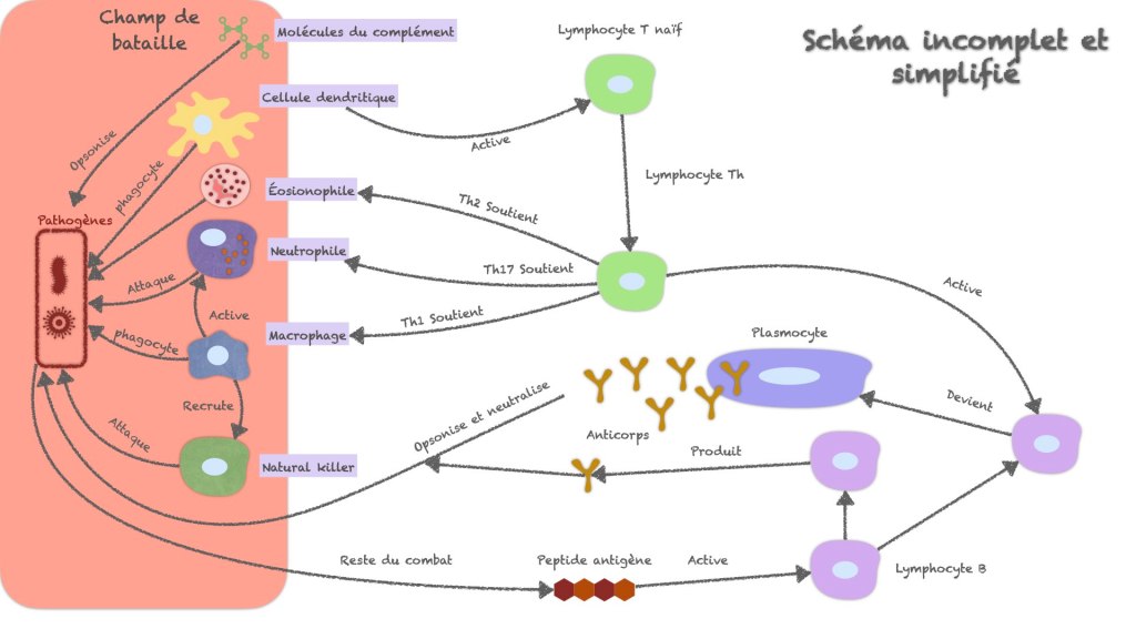C’est pourquoi cette formation vous propose une approche progressive pour démystifier le système immunitaire. Mon objectif est de vous accompagner jusqu’à un niveau de compréhension suffisant pour vous sentir à l’aise avec les concepts de l’immunologie et le genre de schémas présentés ci-dessous en exemple.