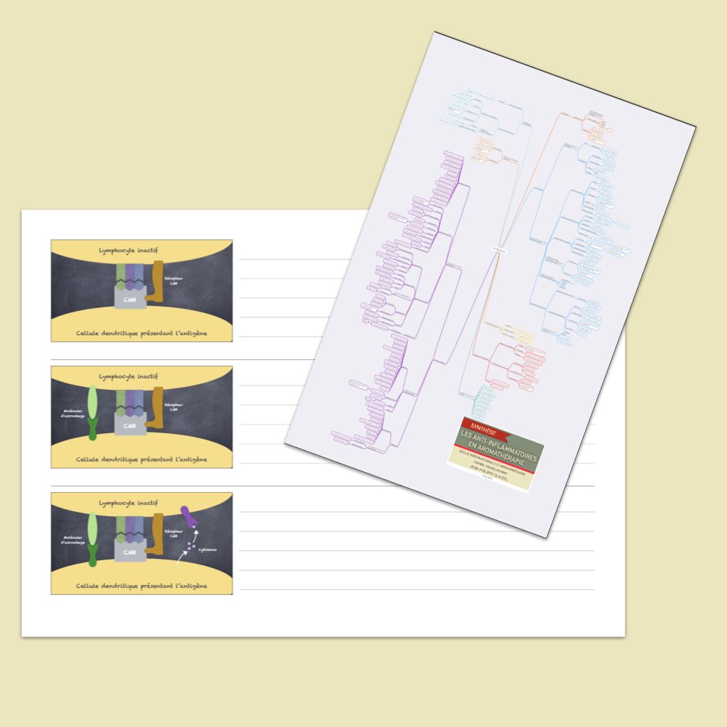 Le cours est accompagné de plusieurs PDF. En premier lieu le PDF des diapos qui sont présentées dans les vidéos, qui vous permettra de prendre des notes, mais aussi un document de plus de 40 pages pour comprendre l’inflammation, un fichier de synthèse décrivant les cellules de l’immunité et un mindmap des solutions en aromathérapie pour agir sur les différents leviers de l’inflammation.